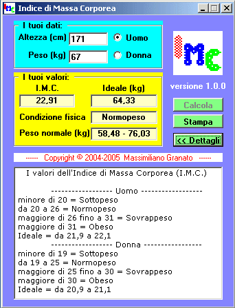 Semplice utility per calcolare l’Indice di Massa Corporea, il peso ideale, la condizione fisica (normopeso, sottopeso, sovrappeso, obeso) e i valori minimi e massimi per essere normopeso.